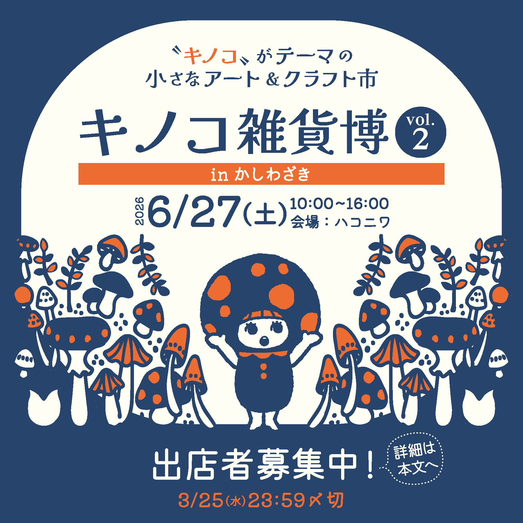 「キノコ雑貨博」略して「キノ博」は、キノコがメインテーマのアート&クラフト市です。